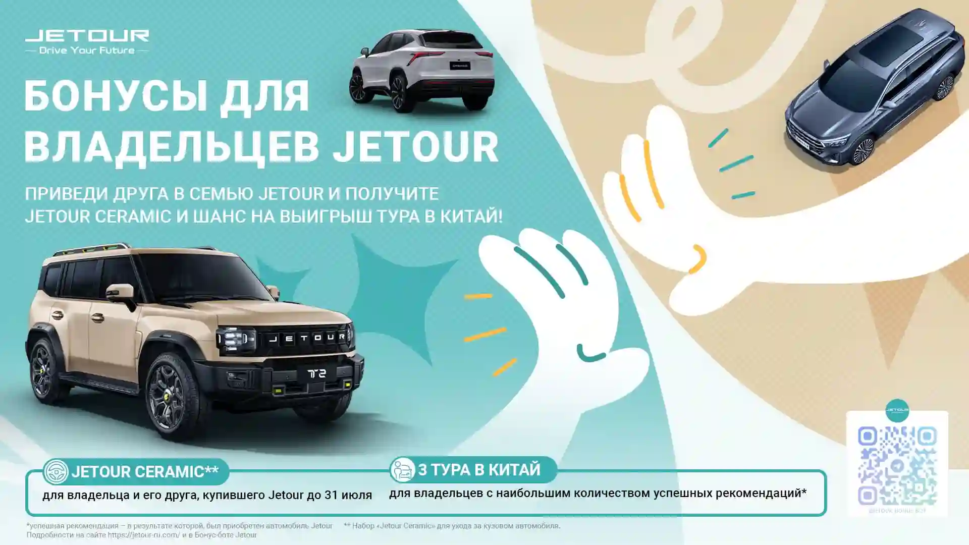 JETOUR объявляет о запуске двух специальных программ для владельцев автомобилей бренда. Текущие клиенты могут получить ценные призы, участвуя в акции «Приведи друга в семью JETOUR», а новые покупатели, приобретающие автомобили JETOUR, получат шанс выиграть путешествие в Китай. Акции действуют с 1 июня по 31 июля 2025 года.